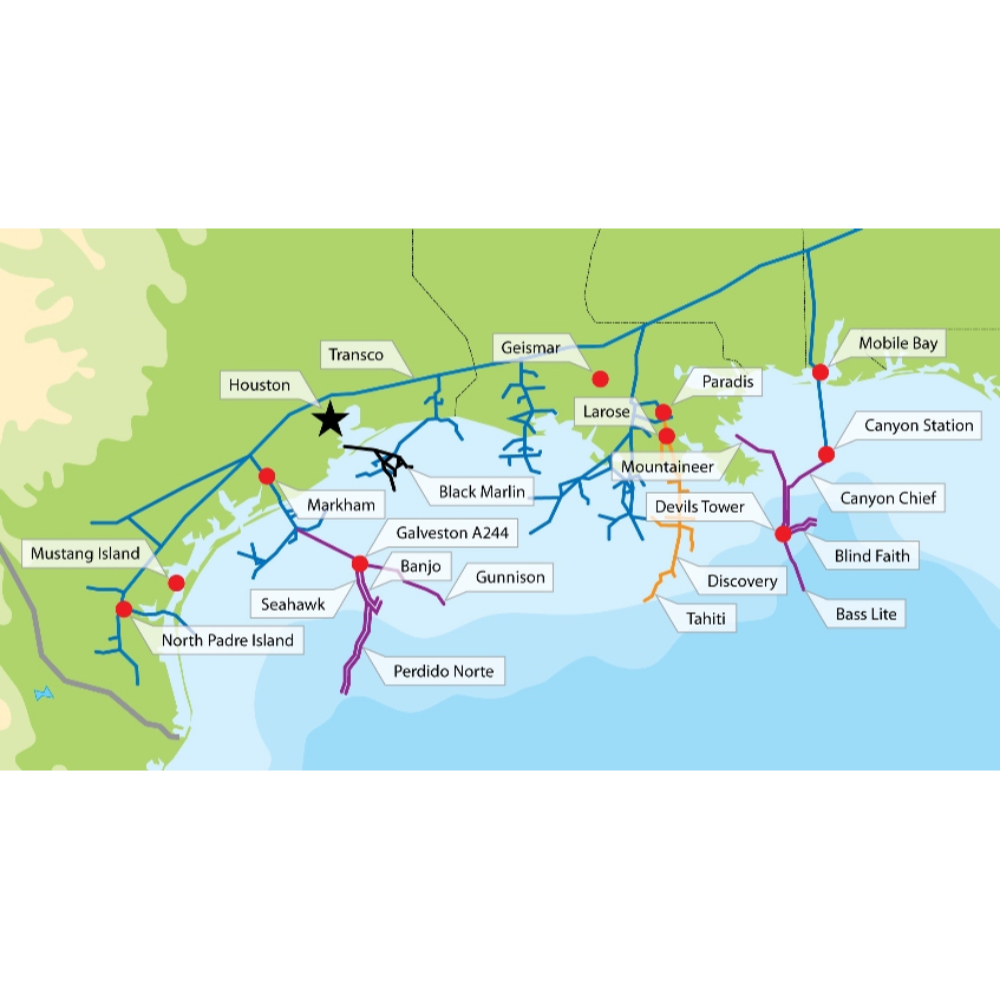 The Tahiti spar is installed in approximately 4,000 ft (1,219 m) of water and supports subsea wells tied back via flowlines and risers. The facility includes multi-stage separation, oil stabilization, and gas compression systems designed for high-pressure production. Oil is exported via a 28-inch pipeline into the Caesar oil pipeline system, connecting to the Poseidon network. Gas is exported via the Cleopatra gas pipeline into the ANR pipeline system. Produced water is treated prior to discharge. The platform includes water injection systems for reservoir pressure maintenance. Power generation is provided by gas turbines. The spar is moored using a catenary mooring system and supports steel catenary risers. Subsea infrastructure includes manifolds and control umbilicals.